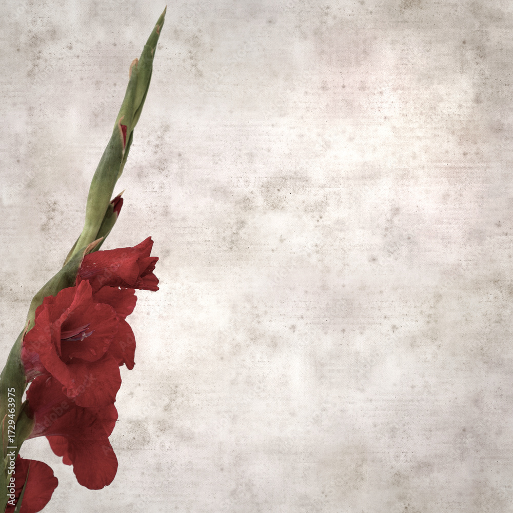 textured stylish old paper background, square, with dark red gladioulus, sword Lily