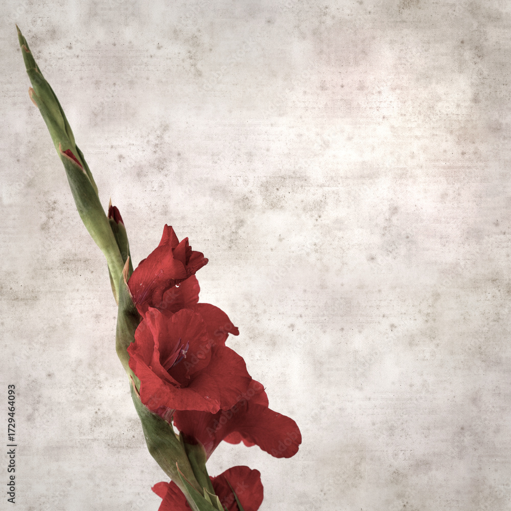 textured stylish old paper background, square, with dark red gladioulus, sword Lily