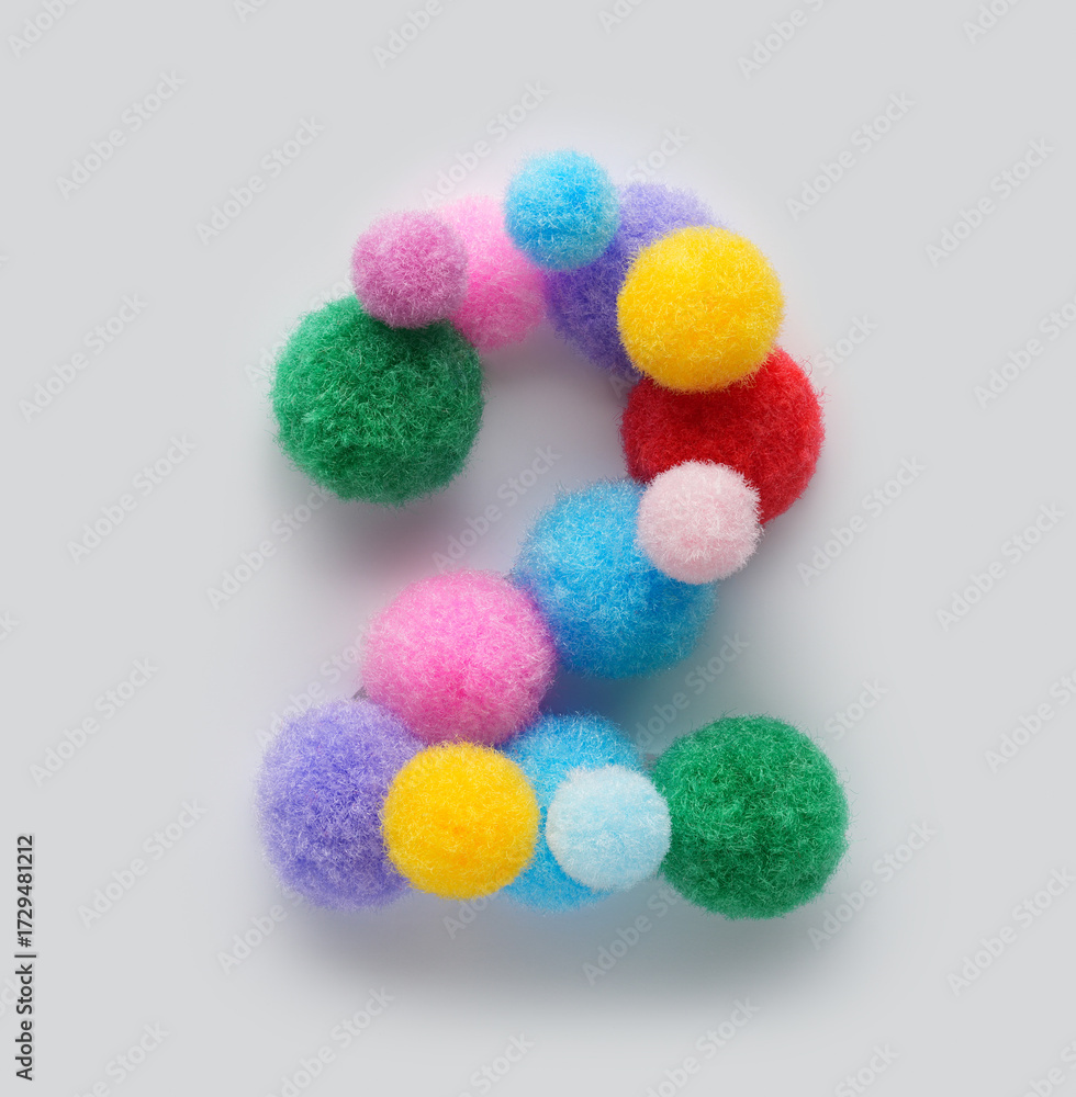 Colorful number two made of fluffy pom poms on white background. Creative handmade typography for kids learning numbers, educational design, playful classroom decor, and graphic projects.