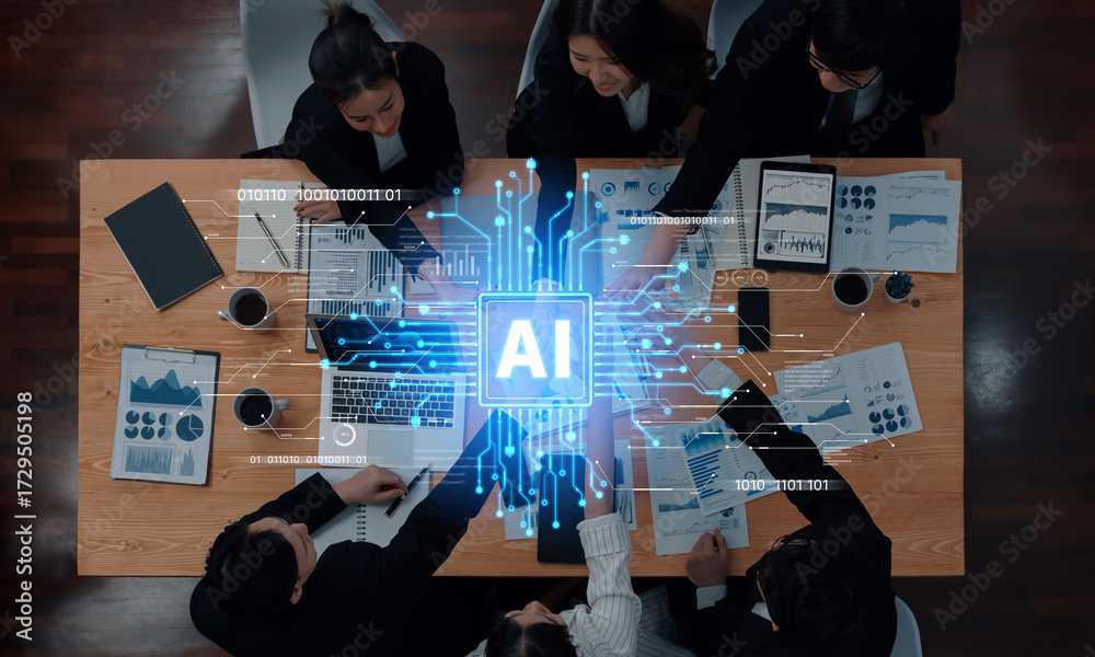 A top-down view of a business meeting where professionals engage with AI technology, showcasing data analysis tools and modern collaboration strategies in a vibrant office. Trope