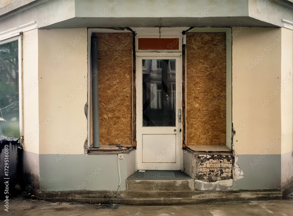 Closed and abandoned storefront with boarded-up windows and damaged facade. The old shop entrance shows signs of decay, cracked plaster, exposed bricks, and a neglected exterior.