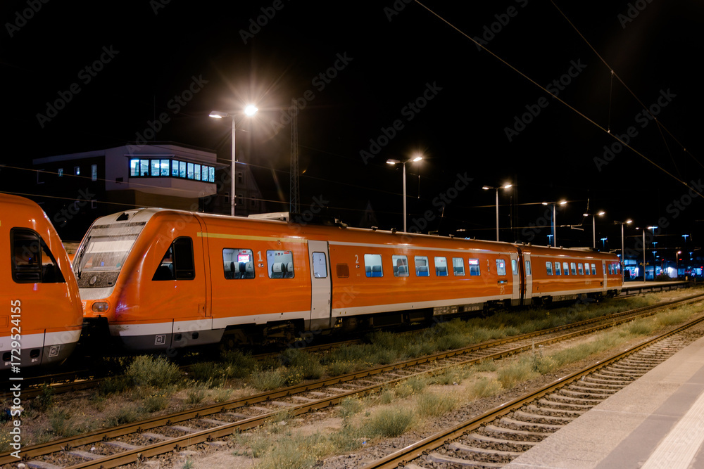 Orange passenger train parked on tracks at night station, illuminated by streetlights, representing travel, transport, and city commuting