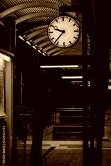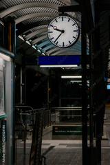 Train station clock illuminated at night, representing punctuality, schedules, and travel atmosphere in public transportation