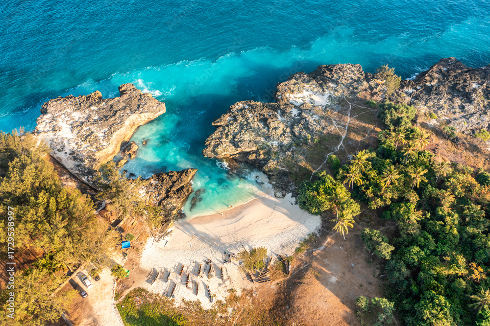 Top aerial drone view of amazing Mandorak Beach, Sumba with turquoise blue sea water. Sumba Island, Indonesia