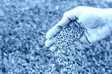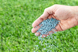 Close-up of hand spreading npk fertilizer granules on lawn.