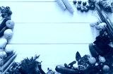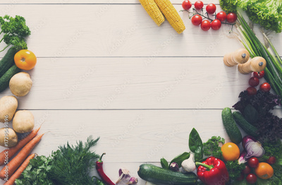 Border of fresh organic vegetables on white wood background. Healthy natural food on table with copy space. Cooking ingredients top view, mockup for recipe or menu