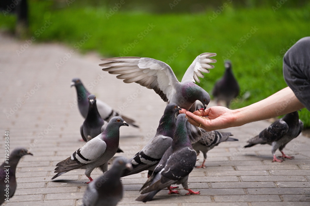 Gołębie jedzące z ręki w parku