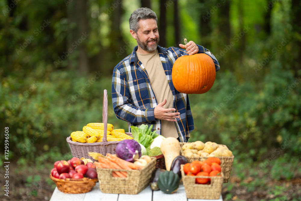 Farmer harvesting fresh vegetables in a rural garden. Farmer with fruits and vegetables at local market. Mature farmer collecting vegetables produce. Farmer holding a basket full of fresh vegetables.
