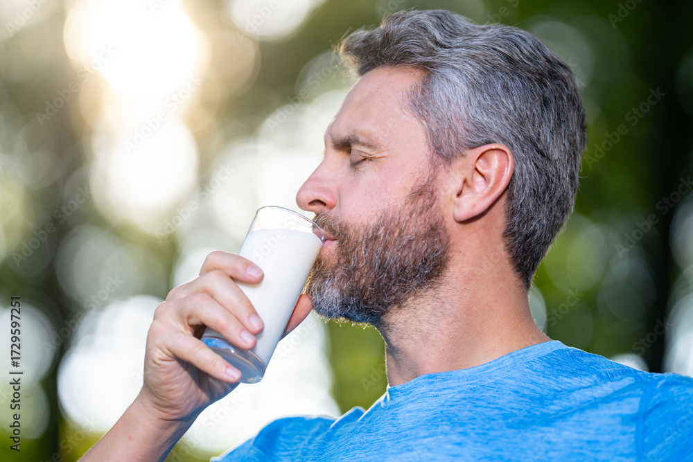 A healthy man holds a glass of fresh milk outdoors. Organic milk as a natural supplement after a workout. Sport man drink glass of milk. A man holds a fresh milk shake as part of a healthy diet.