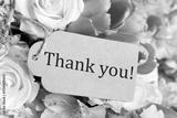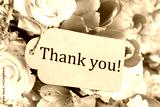 Thank tag and bouquet of flowers , closeup