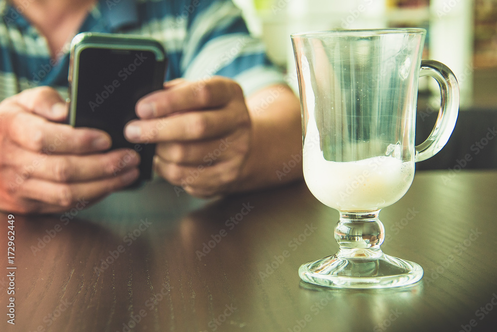 Men's hands hold a smartphone at a table in a cafe. Vintage style