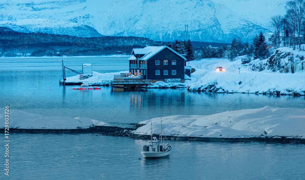 Fisher shelter in winter with fishboat at sunset in the background snowy mountains and Norwegian fjords - Tromso, Norway