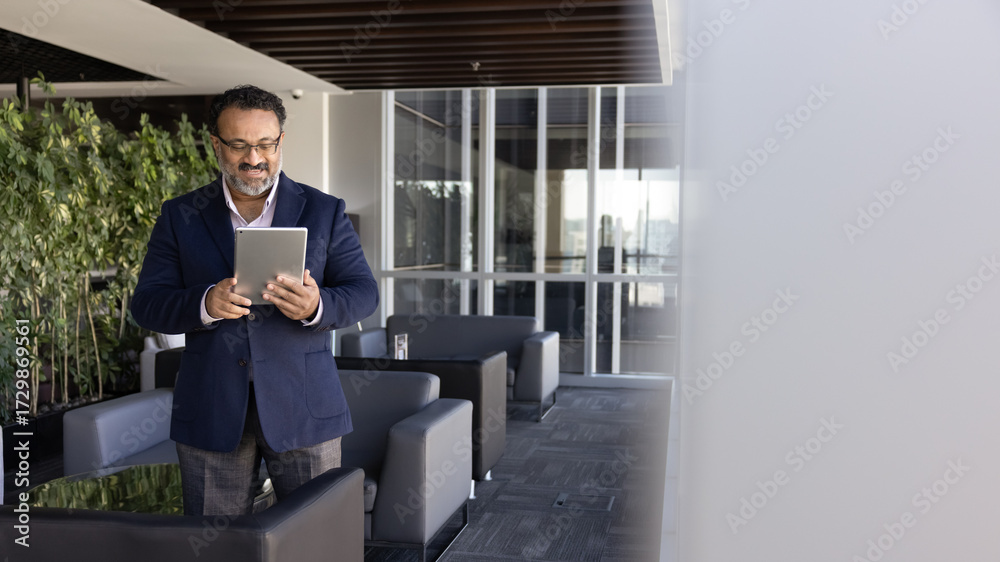 Confident senior businessman using digital tablet to review project data
