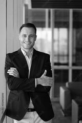 Portrait of businessman smiling, looking at camera in office