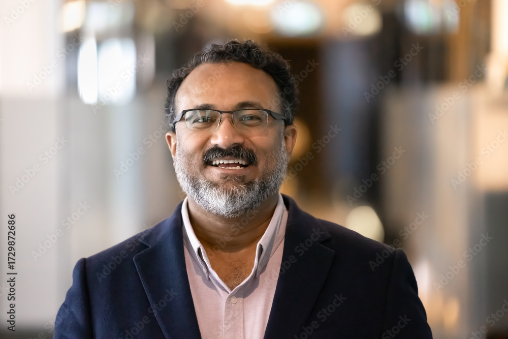 Head shot portrait of older Indian businessman posing for camera
