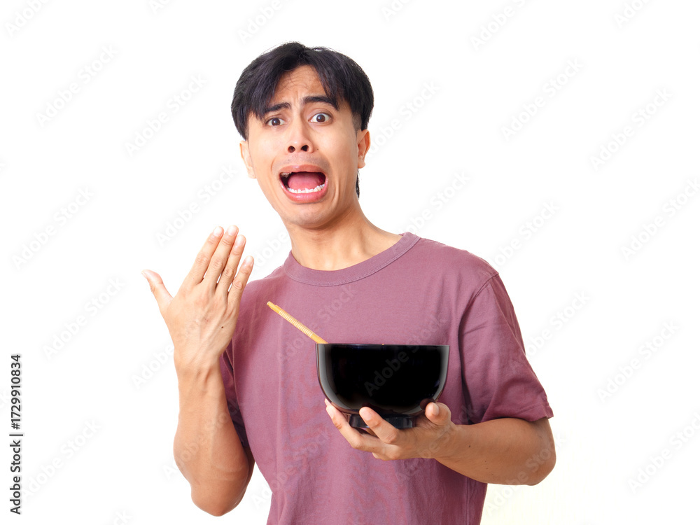 Young Asian man eating noodles with a funny spicy face expression on plain background, showing humor and reaction concept for food and lifestyle themes.