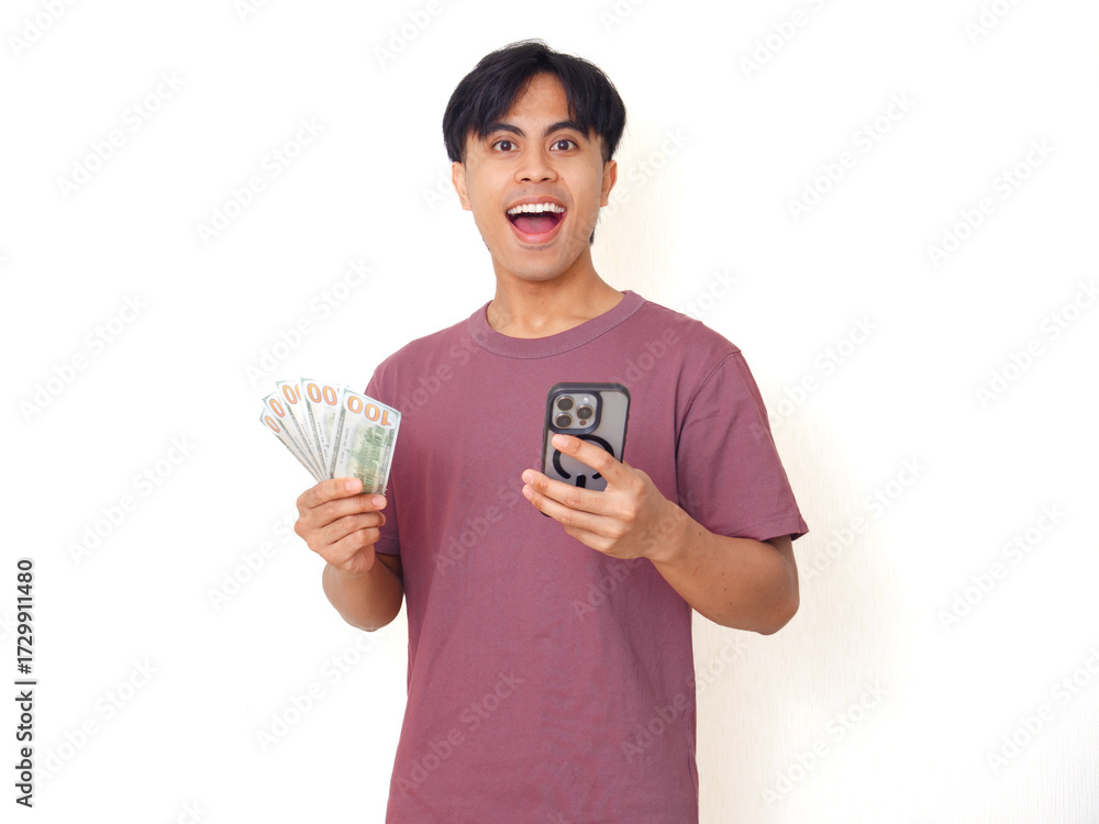 Happy surprised young Asian man holding smartphone and cash with excited wow expression, isolated on plain background, perfect for finance, business, and advertising themes.
