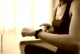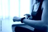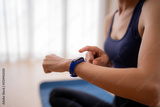 Asian adult female user interact fitness tracker monitoring health activity during home workout for wellness