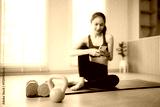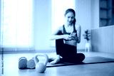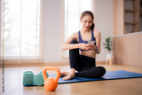 Asian adult woman checking smartphone home workout sunny living room kettlebell dumbbells fitness wellness lifestyle