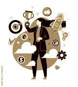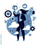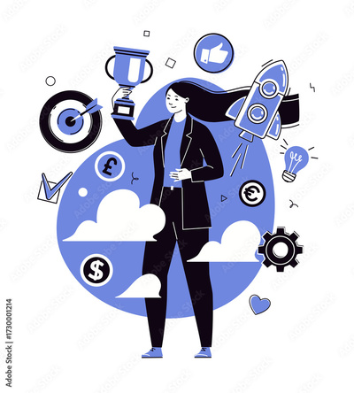Businesswoman Holding Trophy with Rocket and Financial Icons on Transparent Background