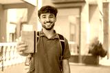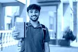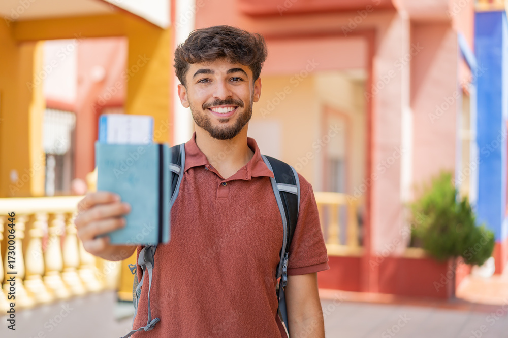 Young Arabian handsome man holding a passport at outdoors with happy expression