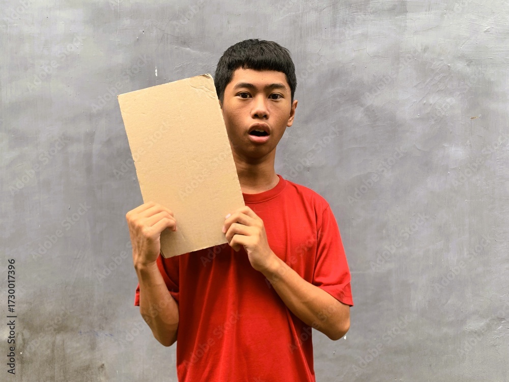 A Southeast Asian teenager in a red t-shirt carries a simple cardboard box, providing a clear visual prop for overlaid text, shocked and startled expression face