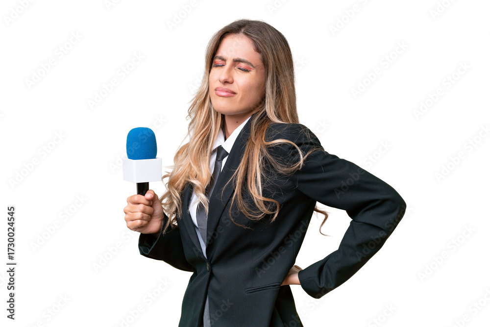 Young pretty Uruguayan tv presenter over isolated background suffering from backache for having made an effort