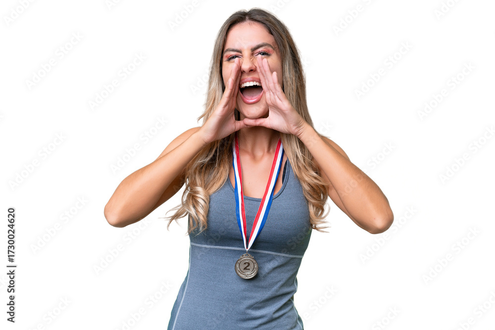 Young pretty sport Uruguayan woman with medals over isolated background shouting and announcing something