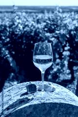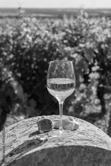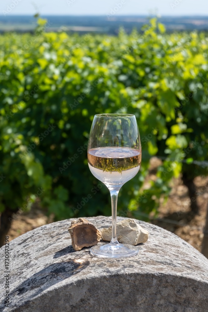 Glass of dry wine from vineyards of Pouilly-Fume appelation and view on vineyards and flint pebbles stones soil, near Pouilly-sur-Loire, Burgundy, France.