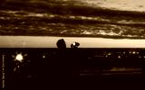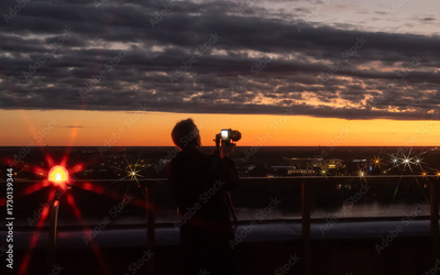 Sunset cityscape with a photographer capturing the beautiful view of the city at dusk. The warm evening light reflects on the skyline, creating a serene and atmospheric scene.