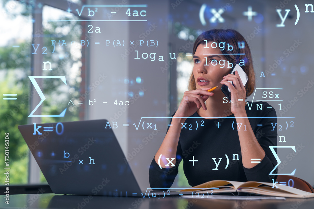 Woman analyzing complex math formulas on transparent screen concept with modern office background, using phone and laptop for data analysis tasks.