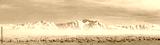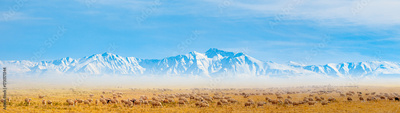 A flock of sheep in the valley Taurus snowy mountains in the background - Adana, Turkey