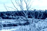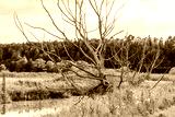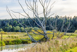 Dry autumn tree with bare branches standing on meadow near pond with forest on background. Sweden.