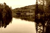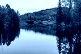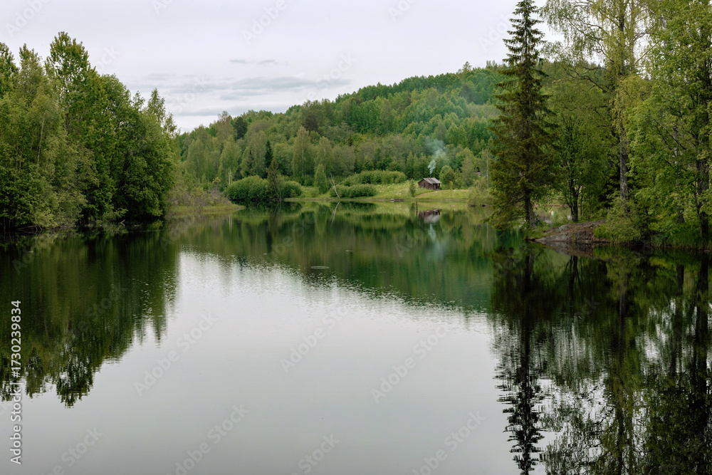Small wooden fishing or sauna hut by the calm lake in middle of the forest. Small log cabin near the bond in summer day. Amazing reflection on the water