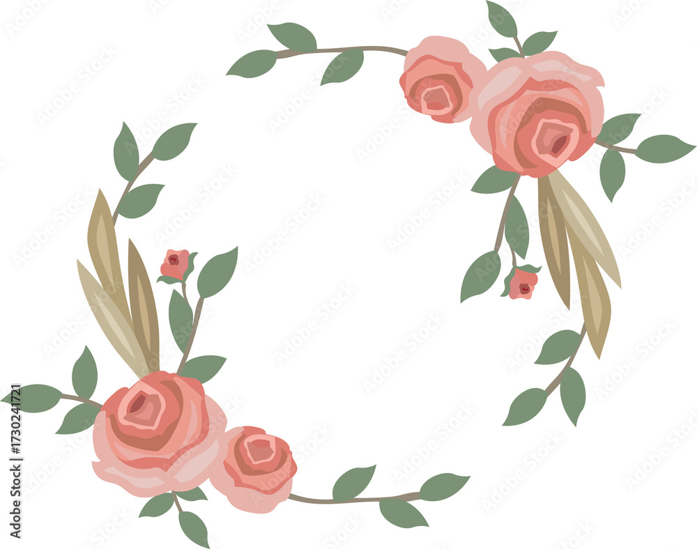 Floral Wreath with Peach Roses and Green Leaves Arrangement on Transparent Background