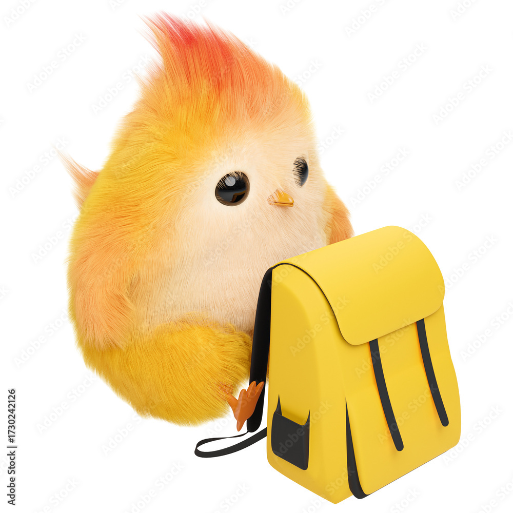 Fluffy Rendered Chick Holding Yellow Backpack Isolated Transparent Background