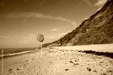 Adaptation for fishing in the sea amber net. Grid for the extraction of amber pieces on the shores of the Baltic Sea. A beautiful beach with fine sand and a steep bank. Amber Coast in Kaliningrad