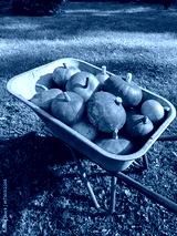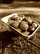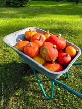 Pumpkins harvested from the garden in autumn, delicious orange vegetables for pureed soup. Organic farming for vegetarians.
