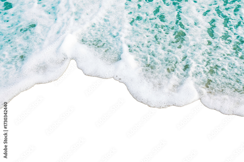 Wave of foamy ocean water gently rolls onto shore, creating serene and calming scene