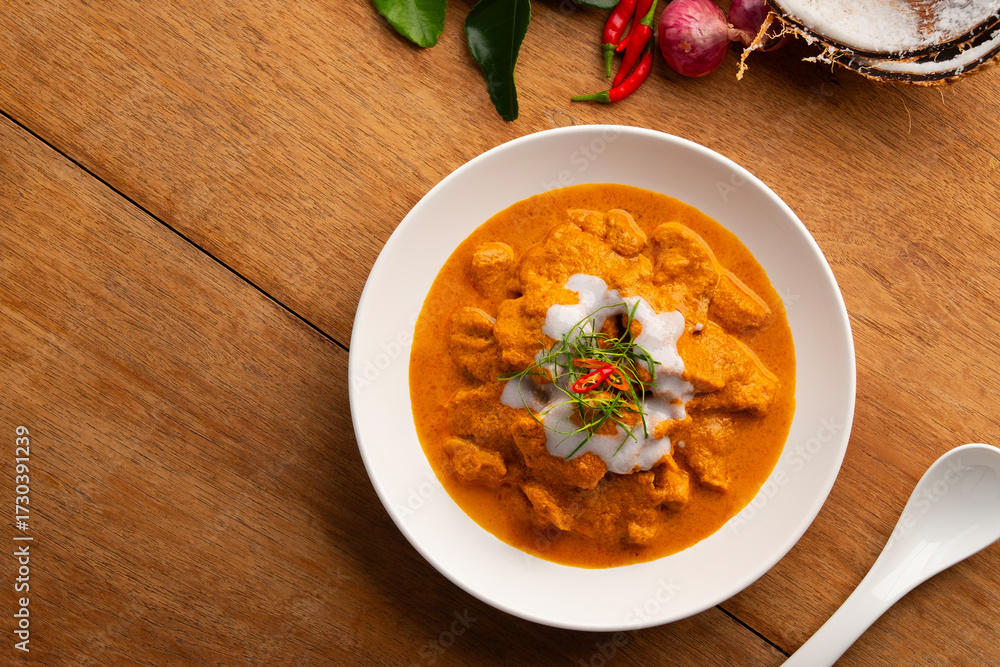 Panaeng Curry with pork.Sliced pork Meat in red curry paste and coconut milk,topping with coconut cream and Shredded kaffir lime leaves.Thai style food.Top view