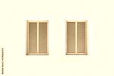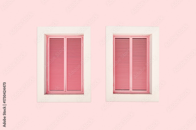 Beautiful wood Window on pastel pink color minimal wall and pink shutters, modern geometric home facade design with soft shadow. Contemporary art, pastel aesthetics, and vintage creative backgrounds
