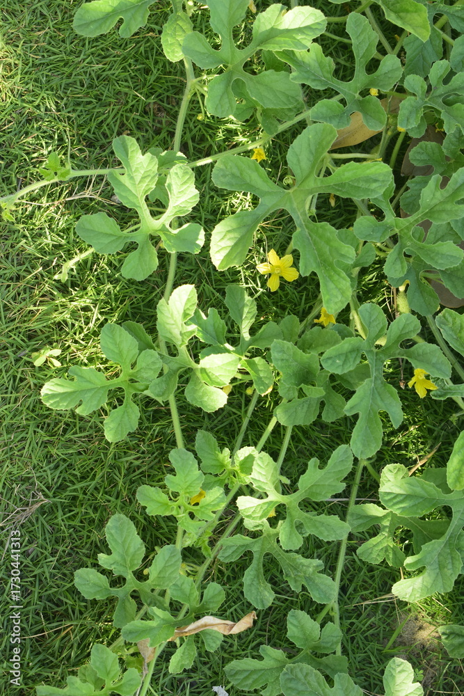 Galhos e folhas da planta de maxixe ao lado de grama verde natural