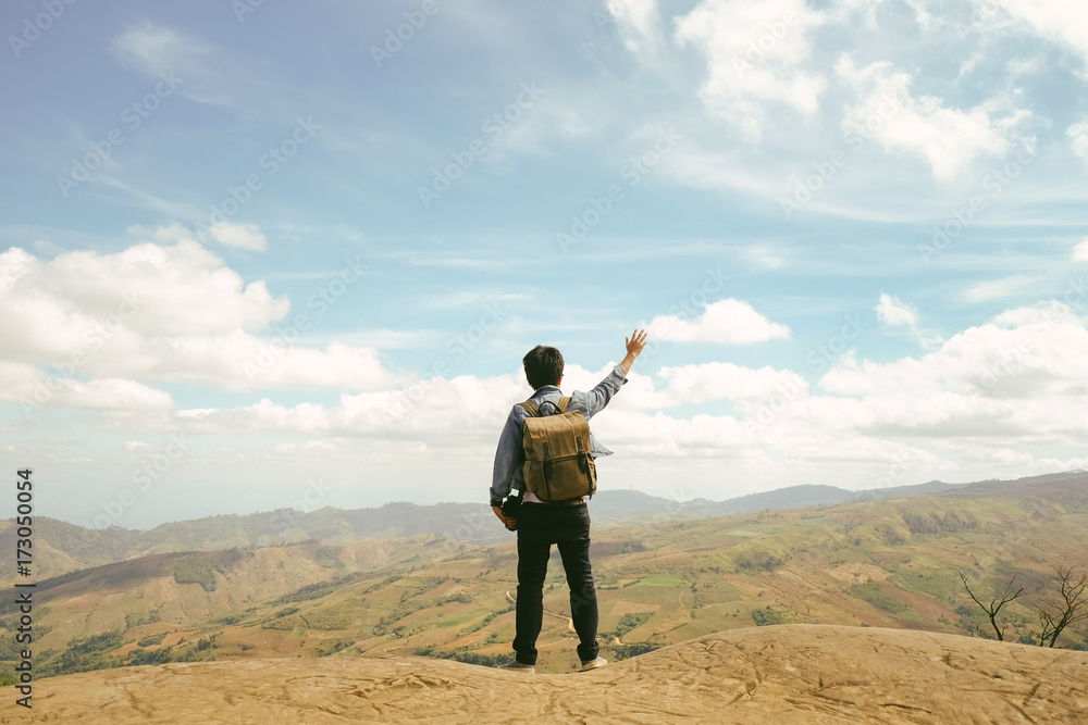 man carry a backpack and look somewhere on the moutain at Phu Lom Lo, Phetchabun, Thailand. . Feel freedom