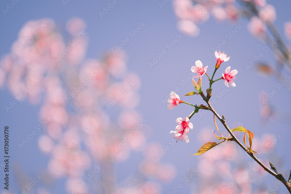 Wild Himalayan Cherry with blue sky and cloud background. Thai sakura blooming during winter in Thailand
