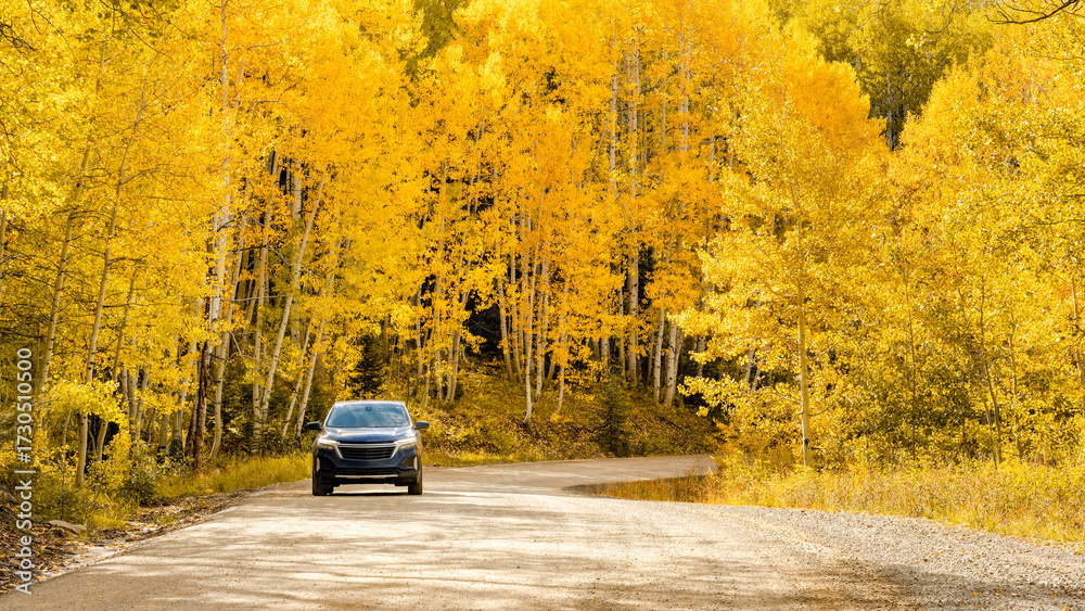 Car diving on winding dirt road through the yellow aspen tree forest during fall foliage. Road trip experience in golden aspen grove. Beautiful autumn scenery in Colorado,USA