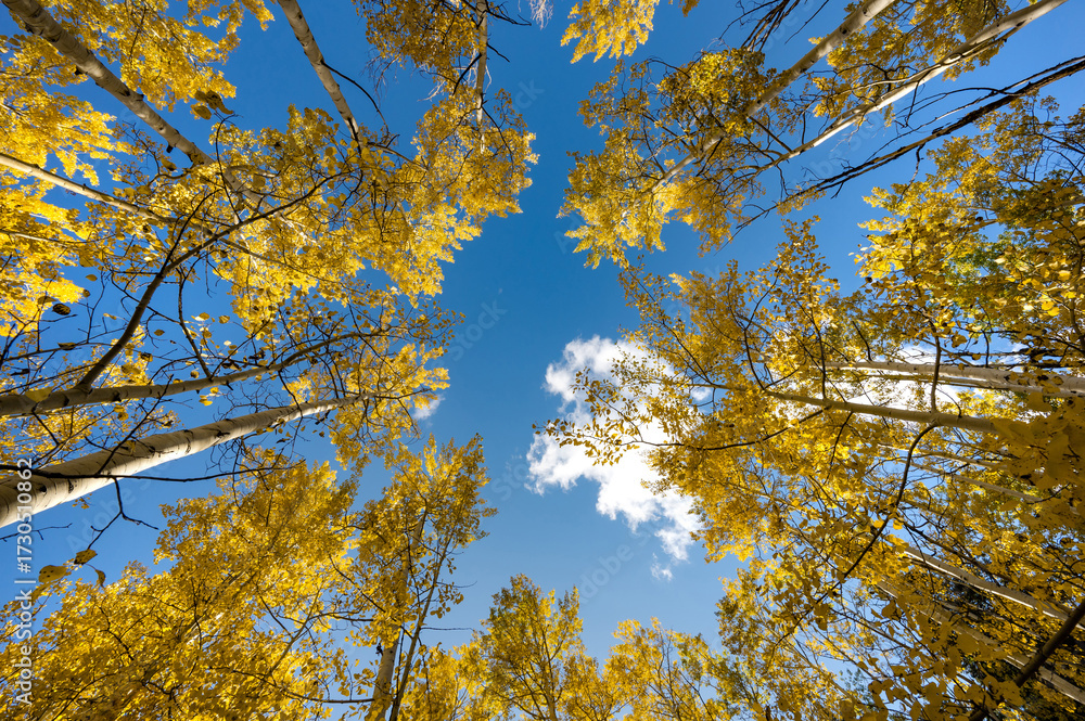 Yellow aspen tree canopy during fall foliage in Colorado, United States. Looking up through golden aspen forest in autumn against the blue sky. Leaves changing color from low angle view