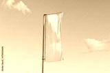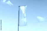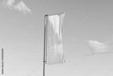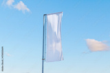 Vertical white advertising flag on metal pole fluttering in wind under clear blue sky, minimal promotional template