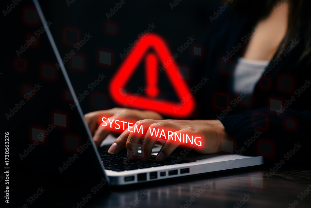 Hands typing on laptop with glowing red system warning sign, symbolizing cybersecurity risk, data breach, virus alert, system failure, and online network protection.