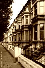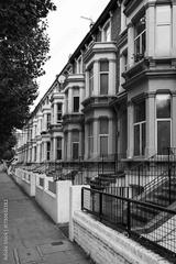 Landmark residential architecture on London street with elegant symmetry, mature sycamore trees: an urban heritage and refined civic design of a retro-style monochromatic photo