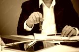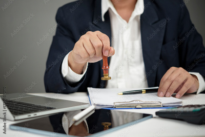 Manager hand holding a stamp for final approval business document. Concept of deal confirmation, project authorization, corporate governance, and certified paperwork with laptop and tablet on desk.